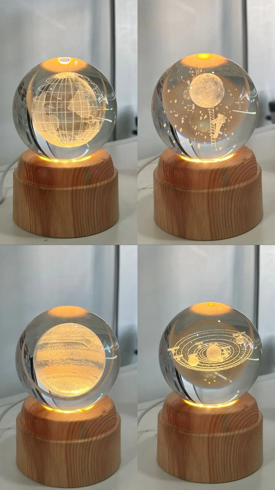 CONTIENE* Bola de cristal de vidrio de 8cm de diametro* Base simil madera con 8cm de diametro con luz led