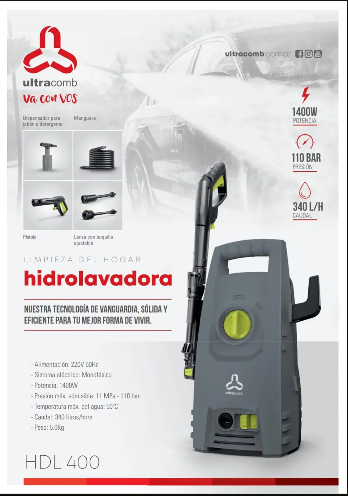 - Potencia: 1400W- Presión máx.: 11 MPa - 110 bar- Caudal: 340 litros/hora- 3 mts. manguera / - Dispensador jabón- Pistola y lanza para alta presión