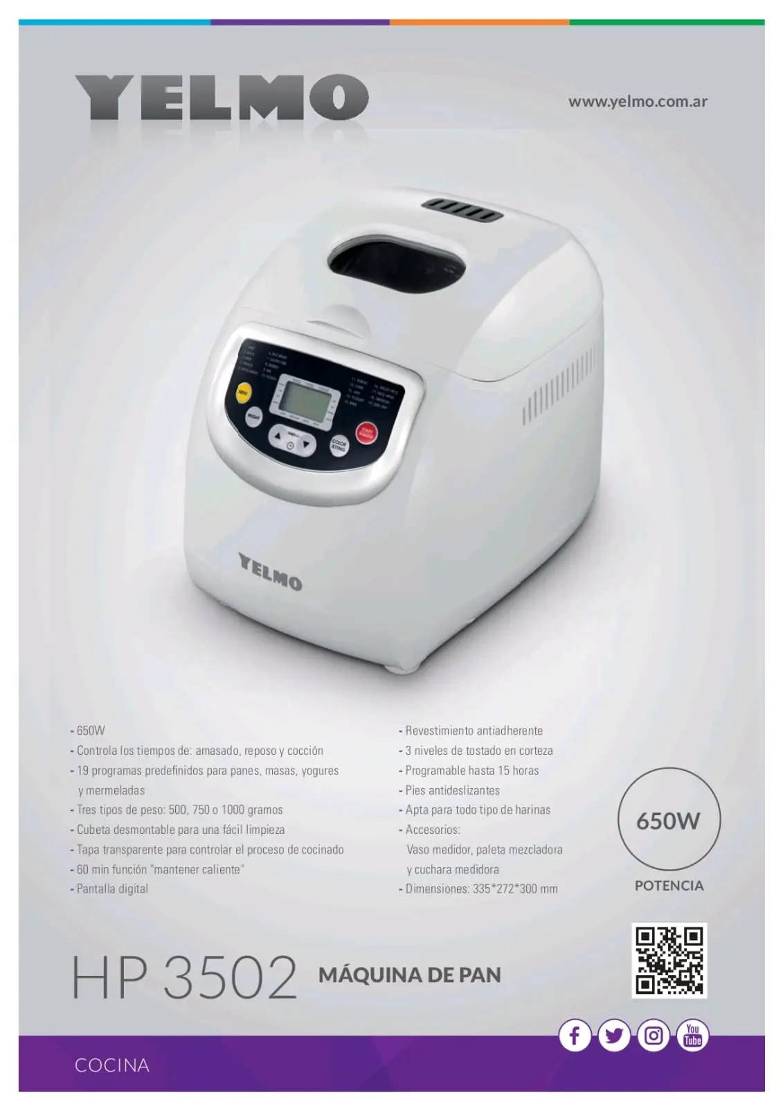 - 650W- 19 programas predefinidos- Pantalla digital- Pan panes de 500 / 750 / 1000 grs.- Dimensiones: 335*272*300 mm.