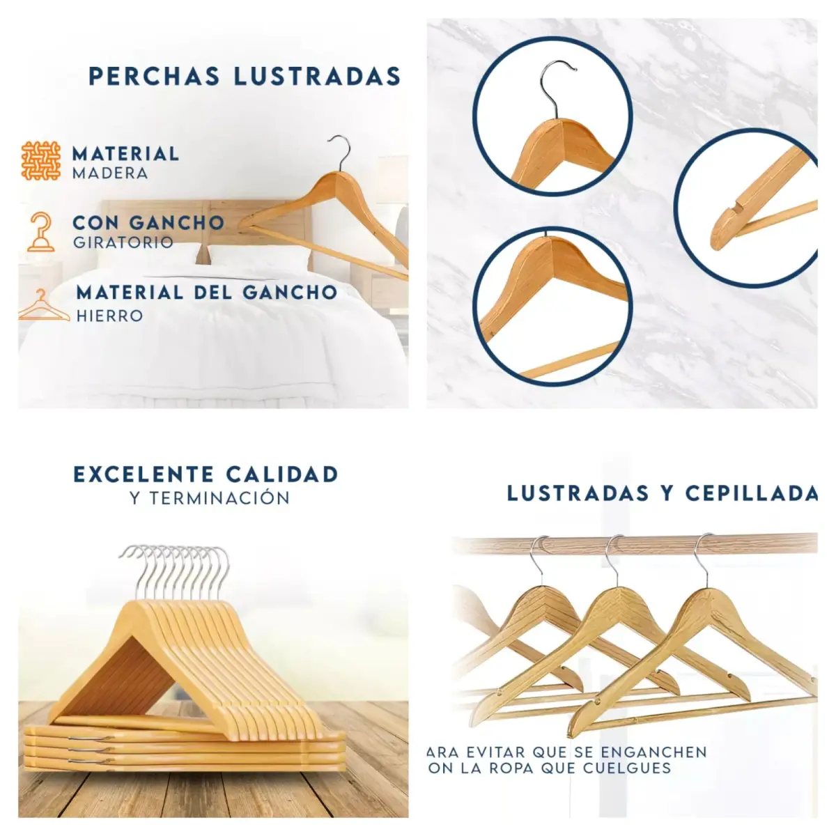 - Su diseño resistente y sofisticado permite colgar camisas, sacos, vestidos y más sin deformarlos. Con ganchos metálicos giratorios y una terminación lisa, estas perchas cuidan tu ropa y optimizan el espacio en tu armario. ¡Organizá tus prendas con calidad y estilo!