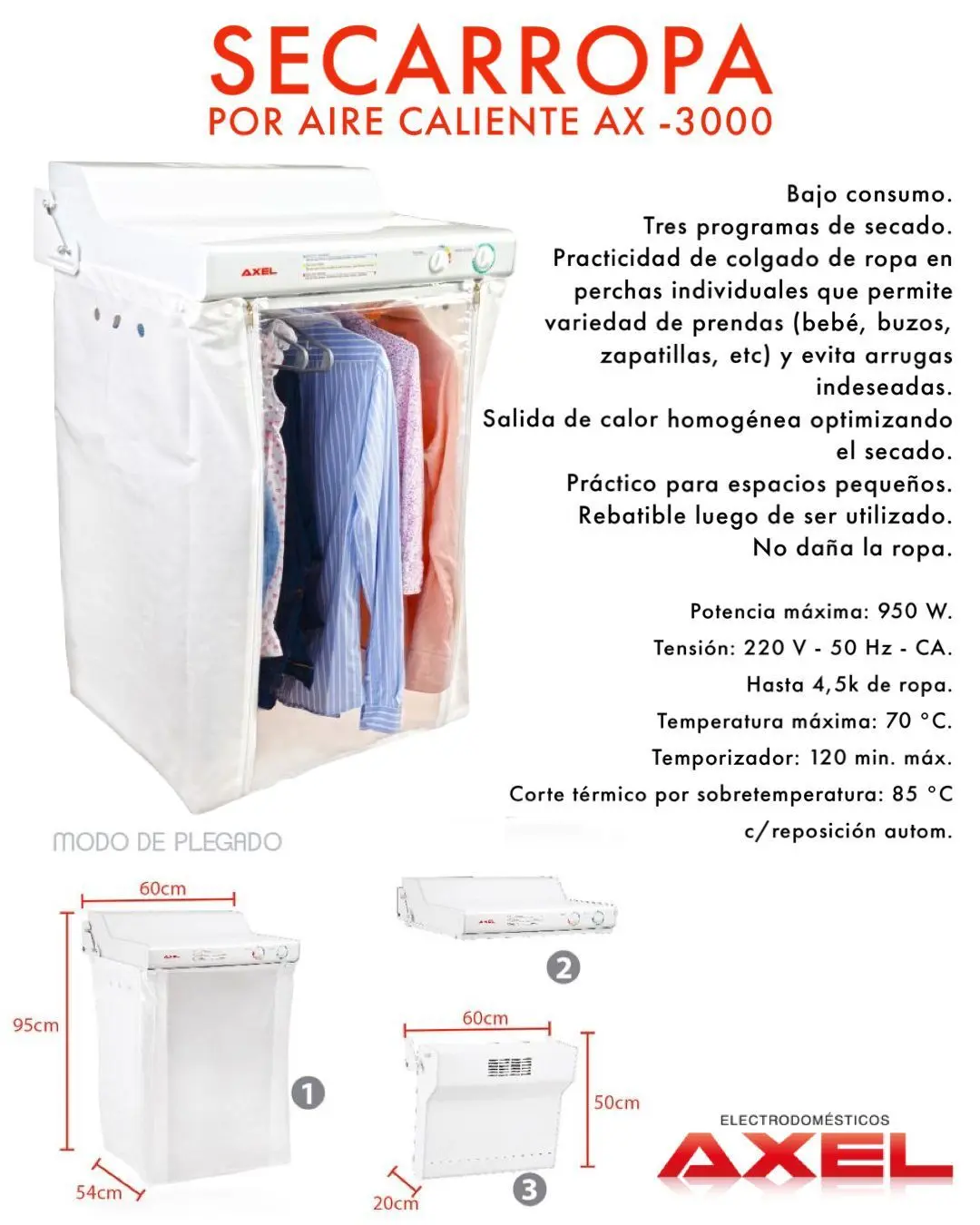 - Tres programas de secado - ropa en perchas individuales que permite variedad de prendas - evita arrugas indeseadas - Salida de calor homogénea optimizando el secado - Rebatible luego de ser utilizado - No daña la ropa.